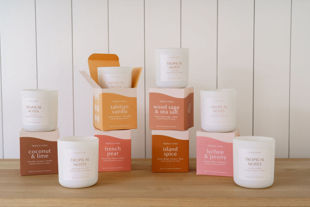 Introducing our Classic Candle Collection — a curated selection of coastal-inspired scented candles designed to elevate both your mood and your space. This collection lies at the heart of the Tropical Notes brand, celebrating coastal living through lush fragrances, effortless simplicity and the beauty of daily rituals.
